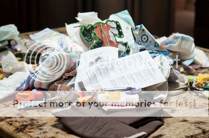 Here's a sampling of some of the contents: More diapers than any kid would need in a three week period, 3 bottles of lotion, 8 lip glosses, box of crayons, lace-up cards, headbands, receipts, 14 granola bars, 11 fruit leathers, a package of crackers, 2 pacifers, 3 pairs of shoes (I was wondering where they ended up!), baby socks, candy, a book, random toys, doctor office papers and a lot of garbage!!
