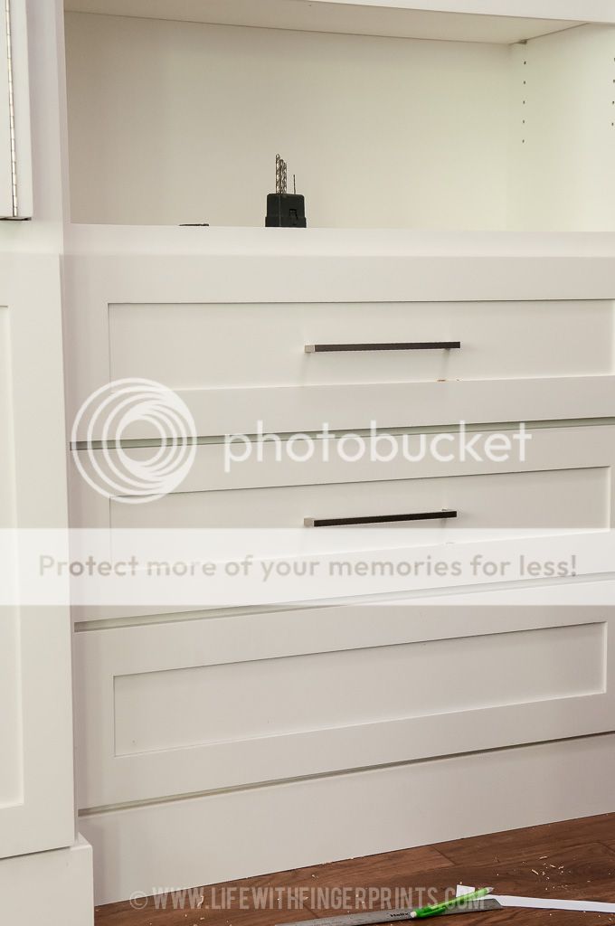 I had all but four pulls installed when I had to rush off to a meeting. Steve mocked my vacuum placement once again but I ignored him. 4 hours later I found myself in a quiet house with all the kids sleeping. I finished up the last pulls while Steve watched a movie and I conveniently vacuumed up my final mess associated with the entertainment center. Now I can leave the vacuum in a different area of the house.