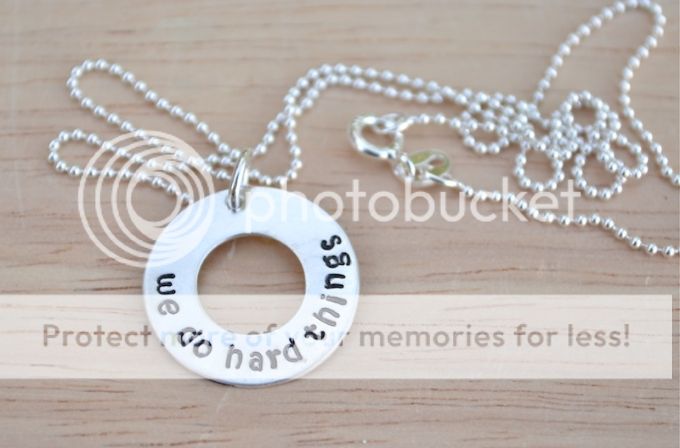 Back when Cannon was born I had a necklace made that said, "I can do hard things". I wear it often. Its my mantra and a theme for our family. I've been asked several times where one can purchase a necklace with their own theme. Steve's sister hand stamps the pieces and she currently has a special on Living Social at a huge discount. You can customize it how you please, whether it be your husband's name, your children's names or something special to you, get this deal. You've got three months to use it which makes it ideal timing for Christmas...or my birthday!