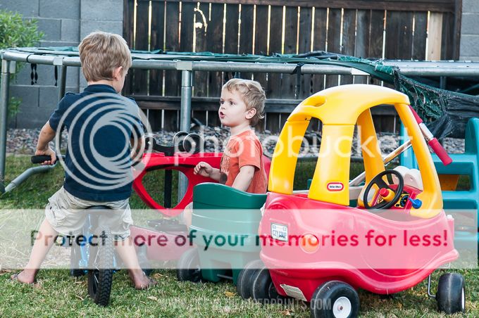 This picture could be recreated every day. They gather their bikes, scooters, cars and wagons in the backyard. The weather is ideal this time of year and they stay busy until the sun sets. For the most part they're all smiles...until Hunter takes Bennett's bike and rides away faster than Bennett can run! Then there's screaming and yelling on Bennett's part - I'm yelling from the kitchen window and Hunter sheepishly walks the bike back and pretends he doesn't know why is brother just threw a colossal fit. Yep - this scene is a daily occurrence!