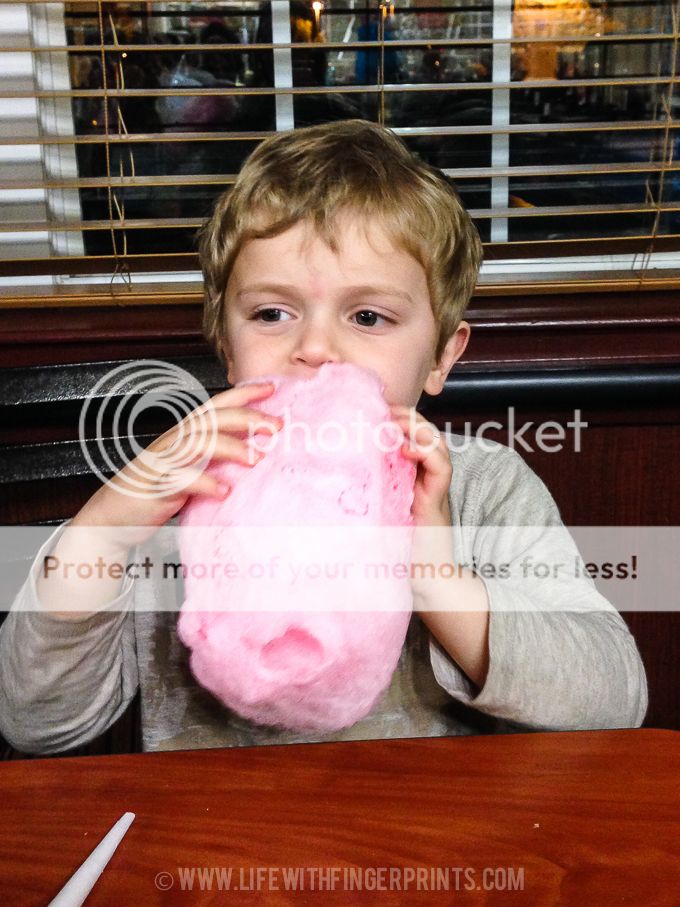 As you can see, he visited the chocolate fountain before finding the fluffy stuff. When we told him to wipe his face, he obeyed immediately - only he used the cotton candy as his napkin.