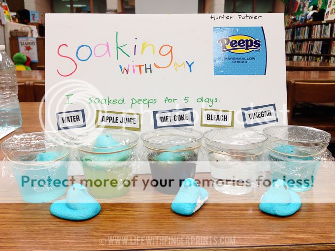 Hunter soaked Easter peeps in five different liquids that I poured for him: Water, apple juice, Diet Coke, bleach and vinegar, for five days.