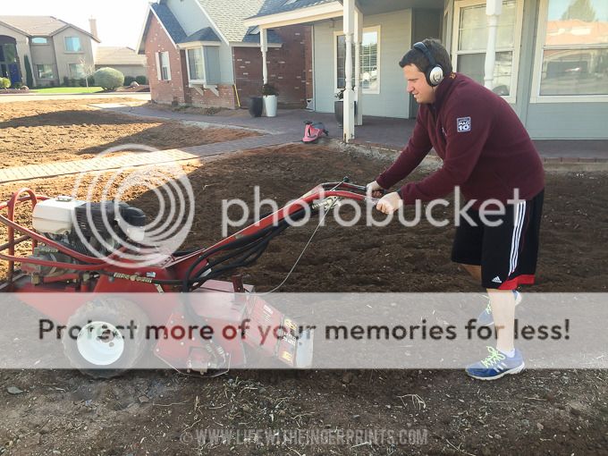 We need to regrade our property after all of our demolition and this was one step in the process. Steve had to manage this 560lb piece of equipment (that we rented) for three hours straight. He has blisters to prove just how rough this was. I give Steve a lot of credit; we hesitated whether we even needed this step, but he owned it and tackled the whole front yard without any complaints. I didn't do a whole lot more than help the kids remove rocks from the soil we turned up and even that was tiring.