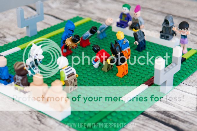 It had me laughing. Batman as the quarterback. The girl Lego Friends as cheerleaders. The guys on the bench, including the Joker, waiting their turn to go into the game. It was a work of art - I love the creativity of children!