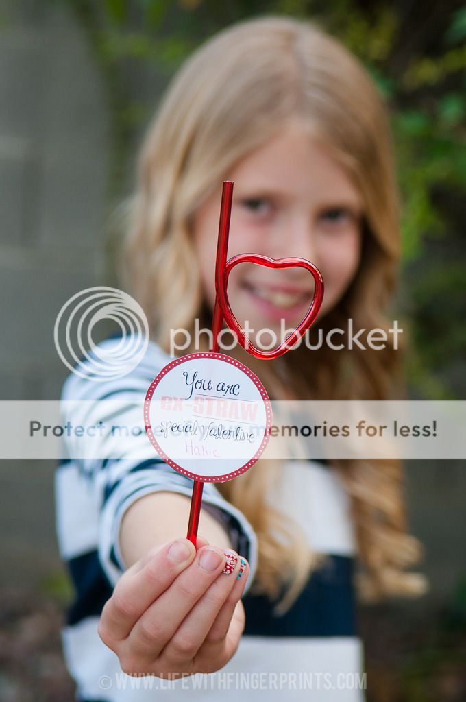 We found heart straws at Hobby Lobby in large packages for just $4. Hallie carefully cut out every circle and taped the straw to the card. We had plenty of straws leftover and the other kids have made it a point to use them every day. I find them everywhere!