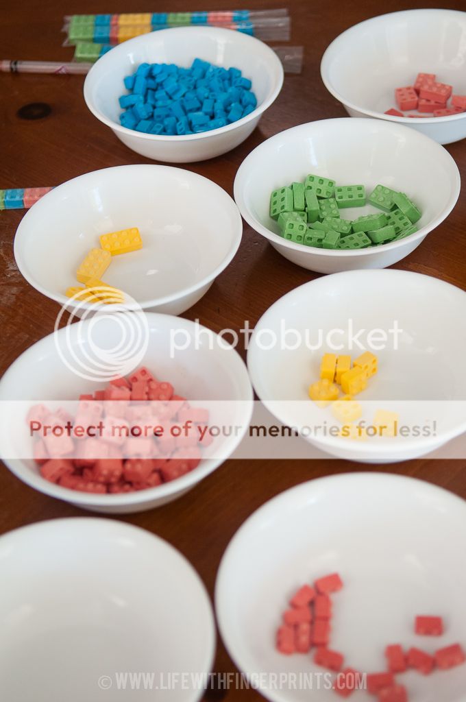 Life with Fingerprints: Lego birthday party treats; lego candy, lego wrapped chocolates, lego jello