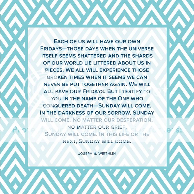 Sunday Will Come. He talks of our Savior's resurrection after such a dark Friday in His life and what that means for each and every one of us. Here's one of my favorite quotes from his talk.
